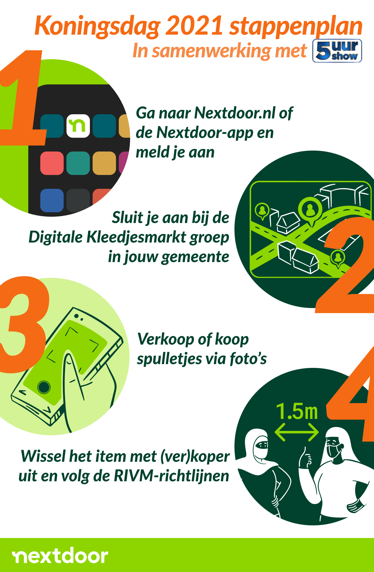 Nextdoor organiseert op 27 april tijdens Koningsdag de tweede editie van de Digitale Kleedjesmarkt. Dit jaar doen we dat in samenwerking met de 5 Uur Show! Om tradities in stand te houden kan je ook dit jaar weer een digitaal kleedje uitleggen om snuisterijen via de Nextdoor-app aan te bieden. Jong en oud kan op 27 april vanaf 9 uur ’s ochtends zijn kleedje uitleggen. Ook dit jaar kunnen we helaas nog niet massaal met de buurt naar buiten om de verjaardag van onze Koning te vieren, maar de kleedjesmarkt biedt een leuk alternatief om je buurt zowel on-als offline beter te leren kennen. Lees hieronder hoe je online langs kunt komen op de markt.