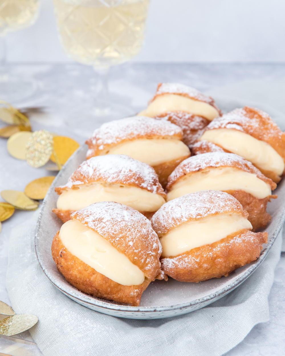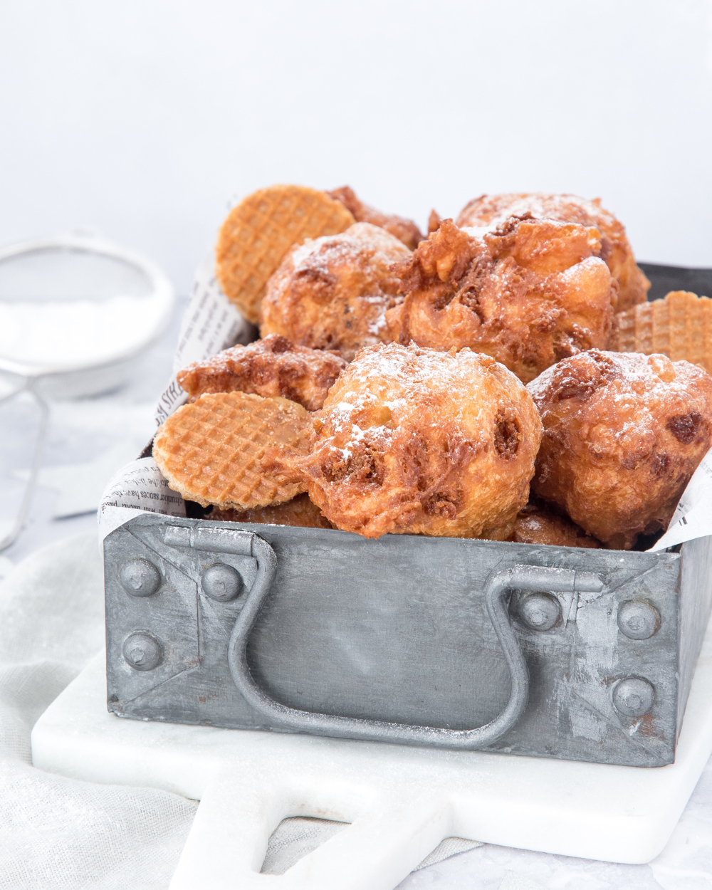 En als je aan de bak gaat voor de buurt, kan het leuk zijn om wat variatie aan te brengen in de oliebollen. Wie weet kun je dan om 00.00 ’s nachts buiten met elkaar proosten (op afstand) en verschillende soorten oliebollen van elkaar proeven. Of je deelt de oliebollen in de middag al uit. Wat dacht je bijvoorbeeld van oliebollen gevuld met banketbakkersroom, stroopwafel oliebollen of appel-kaneel oliebollen?