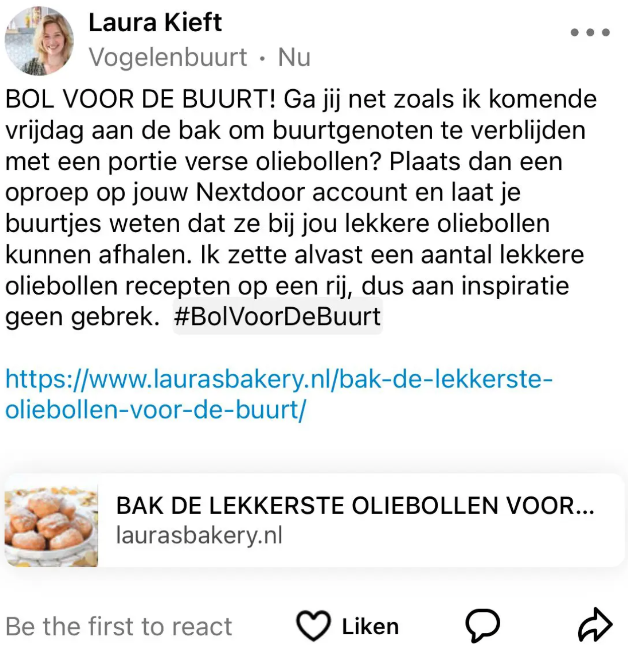 Wie zou jij wel een hart onder de riem willen steken en op oudejaarsdag willen verblijden met een oliebol? In de app van Nextdoor kun je een oproep plaatsen, waardoor buurtgenoten die wel een oliebol zouden lusten kunnen reageren op jouw bericht. Of misschien weten andere buren nog beter wie er in jouw buurt een goede oliebol kan gebruiken. Vergeet niet de hashtag #BolVoorDeBuurt te gebruiken, op die manier stimuleer je jouw buren ook weer om mee te doen aan dit mooie initiatief. Ik plaatste zelf ook een oproep.