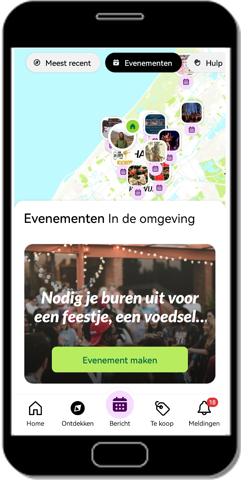 Organiseer je een evenement rondom de feestdagen of ben je benieuwd of er een leuk evenement in jouw buurt is? Kijk dan eens bij ‘ontdekken’ op Nextdoor. Via de groene knop maak je eenvoudig een evenement aan, die vervolgens in de lijst met evenementen in jouw buurt en op het kaartje verschijnt. Handig toch?